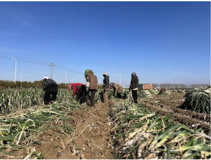 10月28日上午,铁岭市银州区龙山乡西辽海村的一片大葱种植基地已是人头攒动,数十位农民弯腰忙碌,动作娴熟地将一棵棵茎白叶绿的大葱从泥土中拔出,去泥、捆扎、装车,一气呵成,空气中弥漫着大葱特有的辛香和泥土的芬芳。
